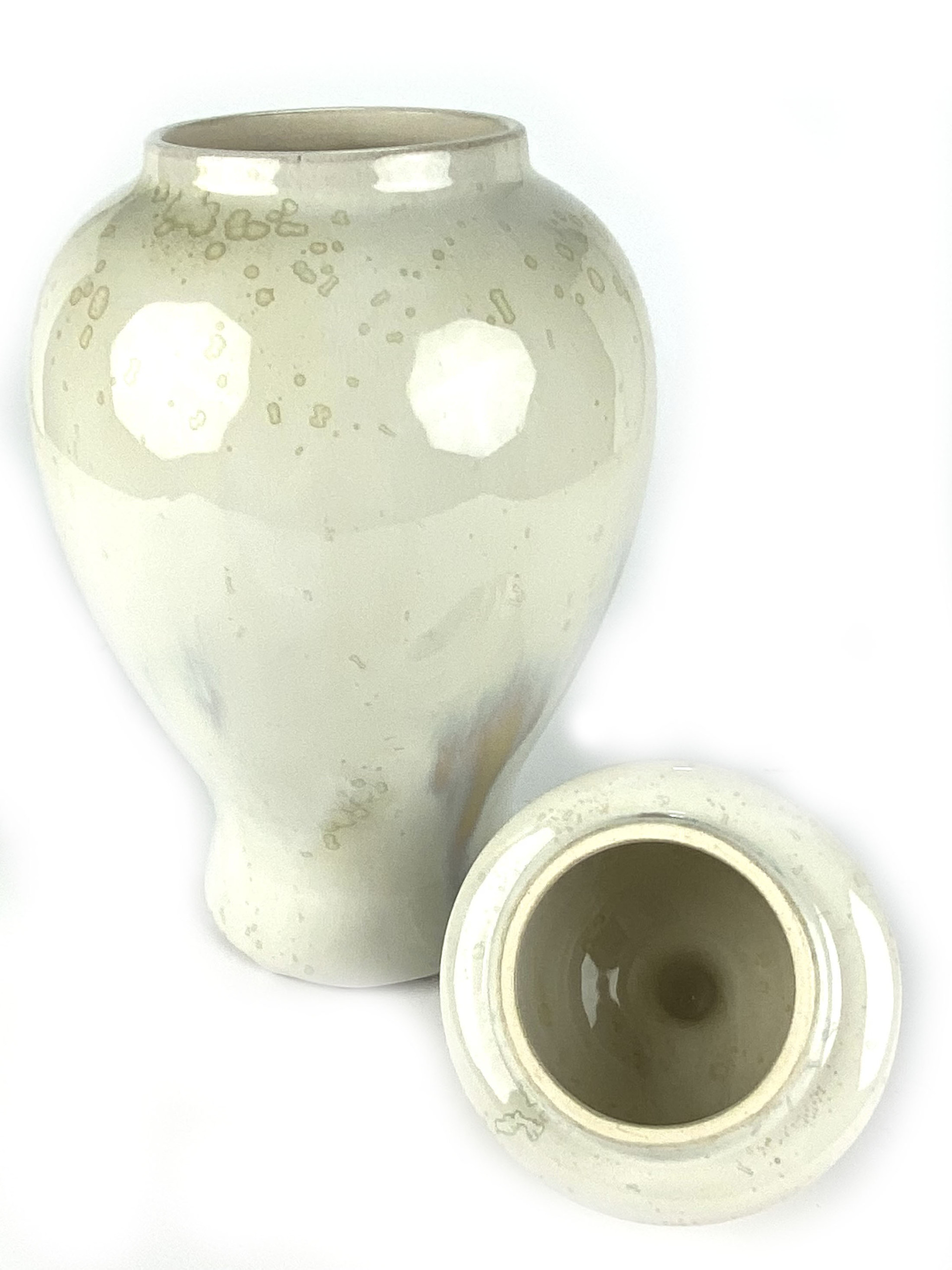 Dekselvaas waarop een mooie champagnekleurige glazuur op is gezet.