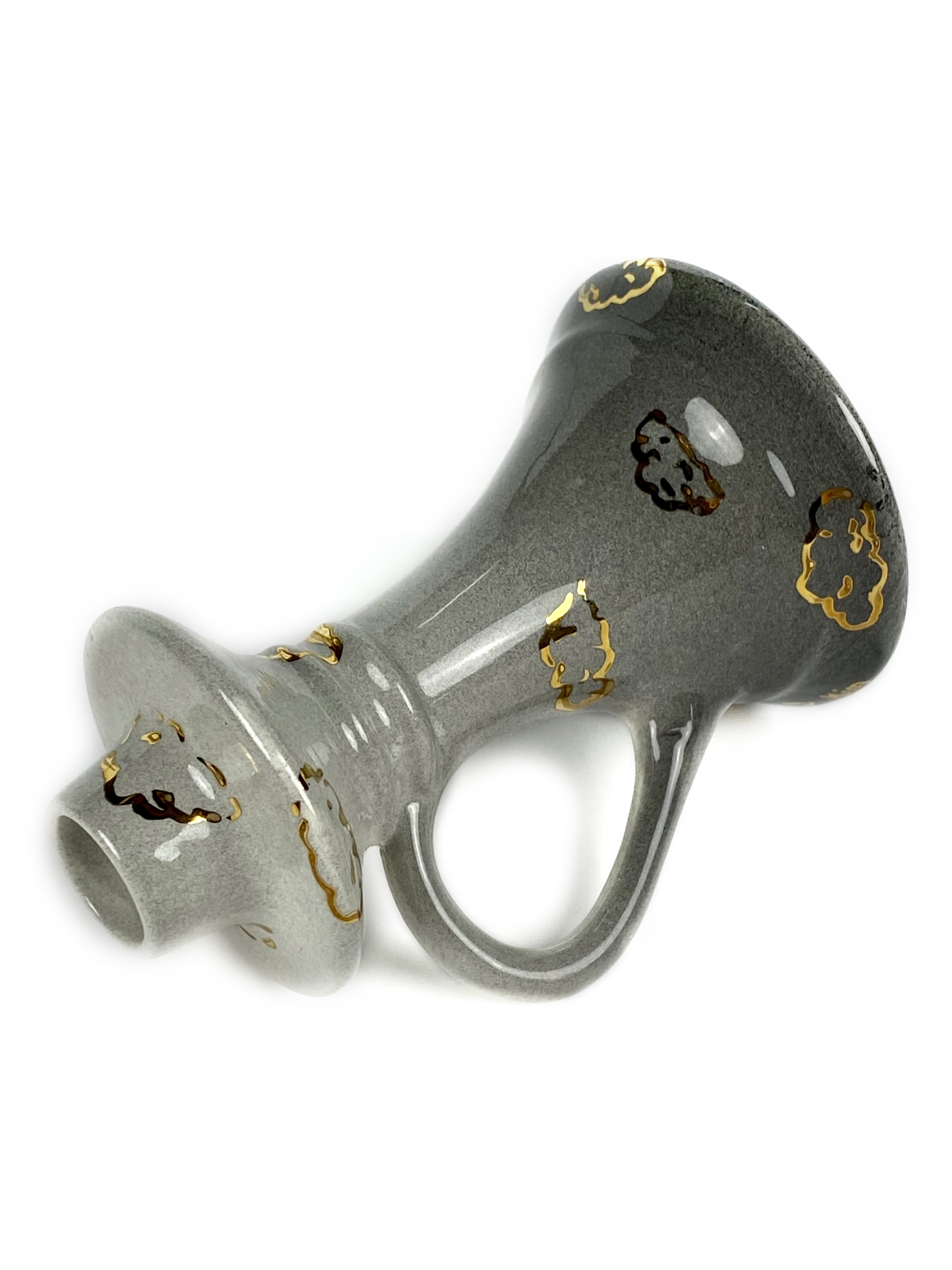 Kandelaar in gradiënt gespoten grijs. Hierop zijn in een 3e stook met de hand gouden wolkjes op geschilderd