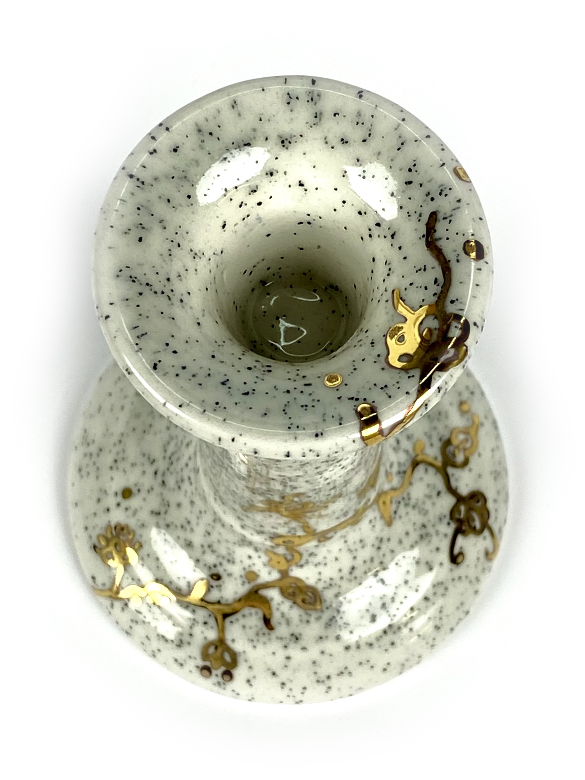 Ronde kandelaar met gespikkeld glazuur. Over de kandelaar groeien delfts blauw geïnspireerde gouden takken met bloemen en bladeren. Deze kandelaar is voor een extra 3e keer de oven in geweest om de handschildering in 24k goud te kunnen doen.