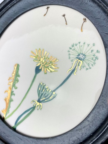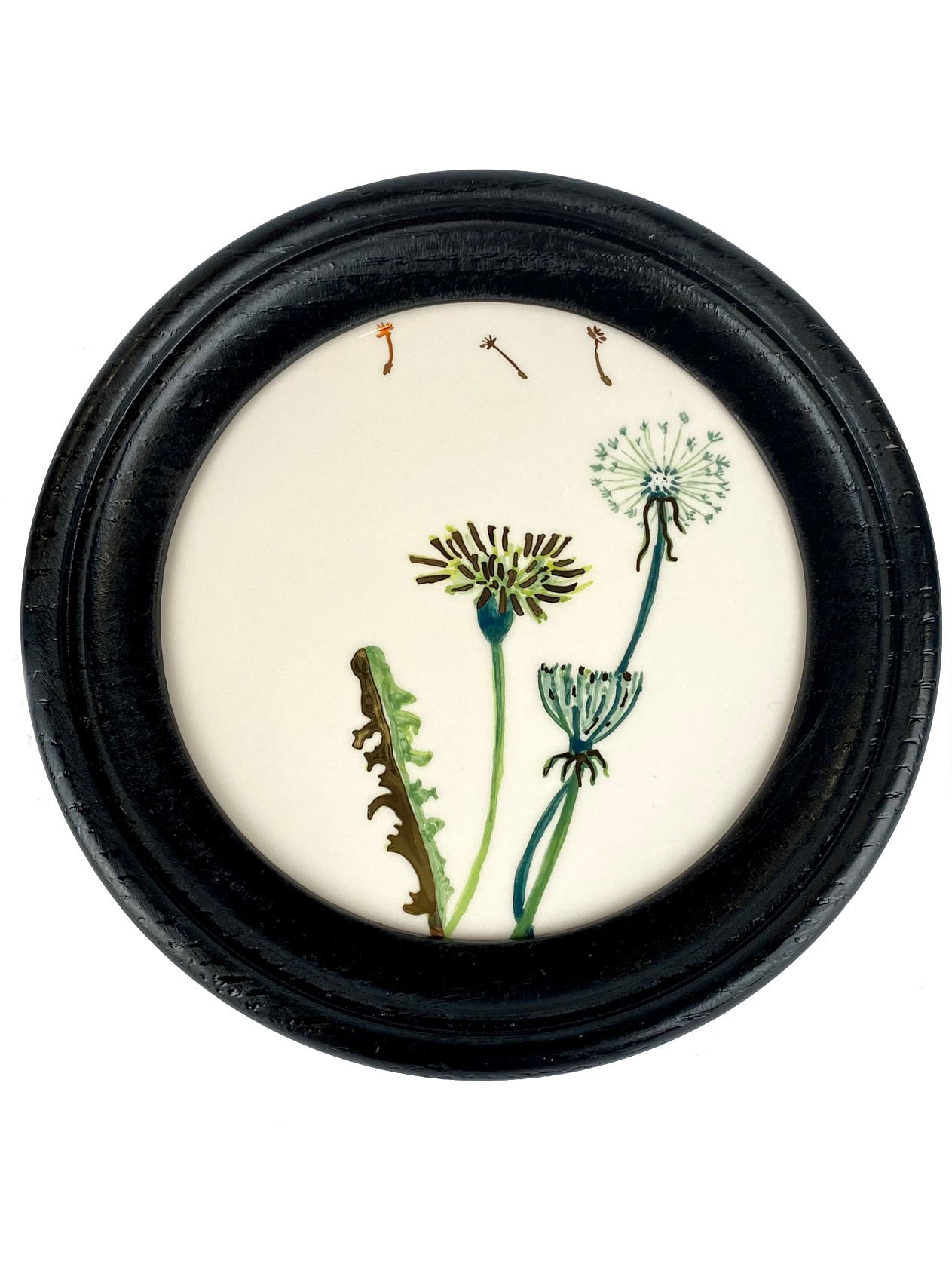Ronde tegel met een schildering van paardenbloemen. De diameter van de tegel is 15 cm, met lijst 20,5 cm.